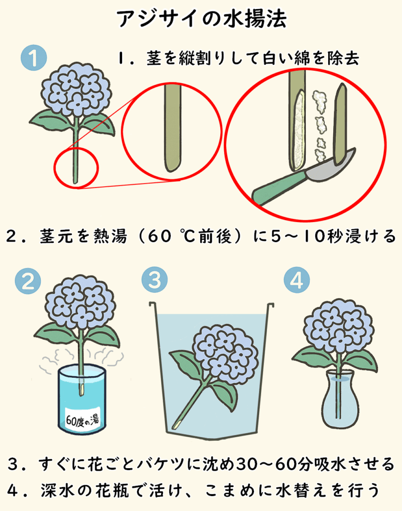 - 湯揚げ:切り口を熱湯に数十秒→直ちに常温水へ。導管の気塞を抜く。