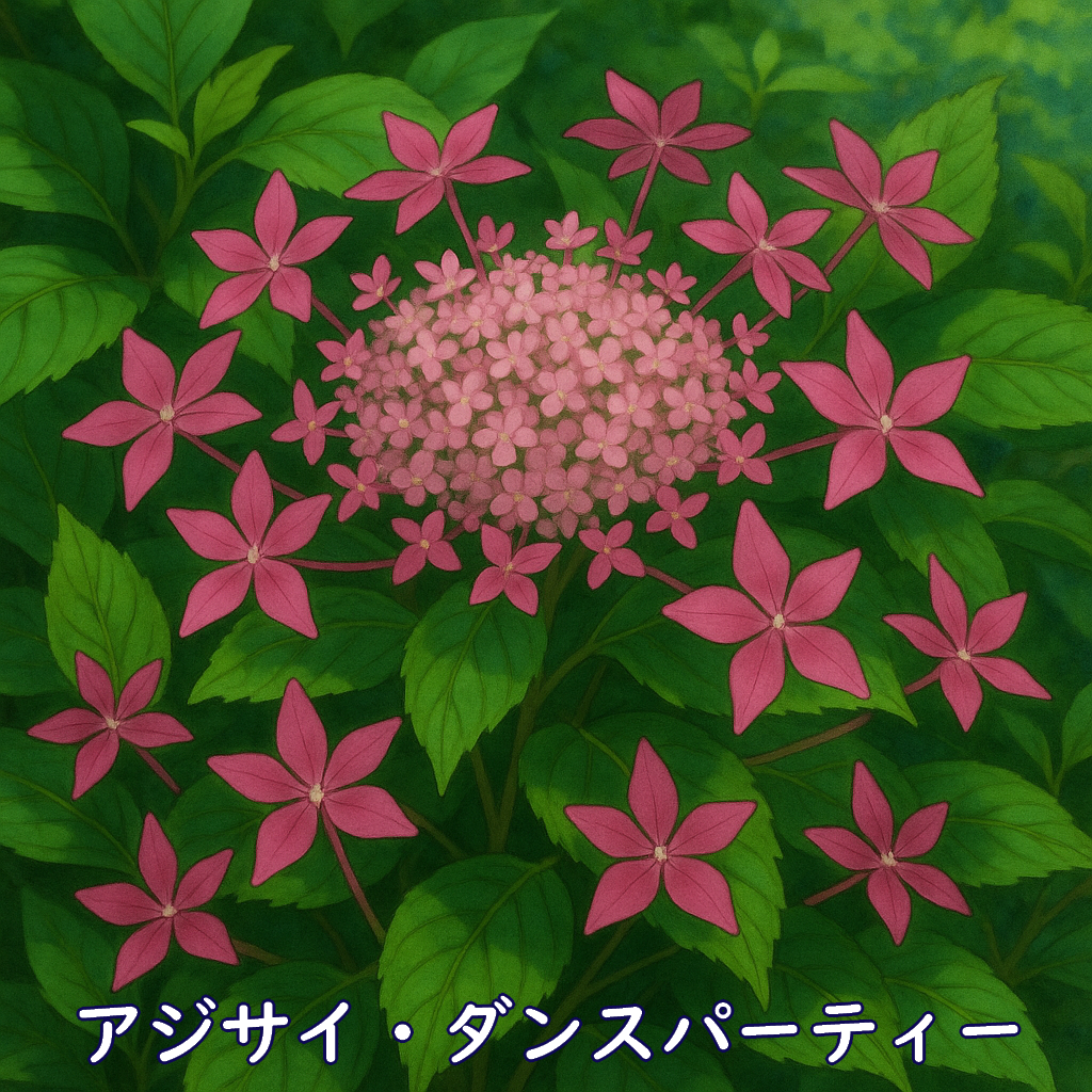 - アジサイ・ダンスパーティー(ホンアジサイ系・額咲き/八重装飾花) – 星形の細弁が踊るように配列。淡桃〜青系で優雅、花付き良く鉢・庭どちらでも楽しめる。