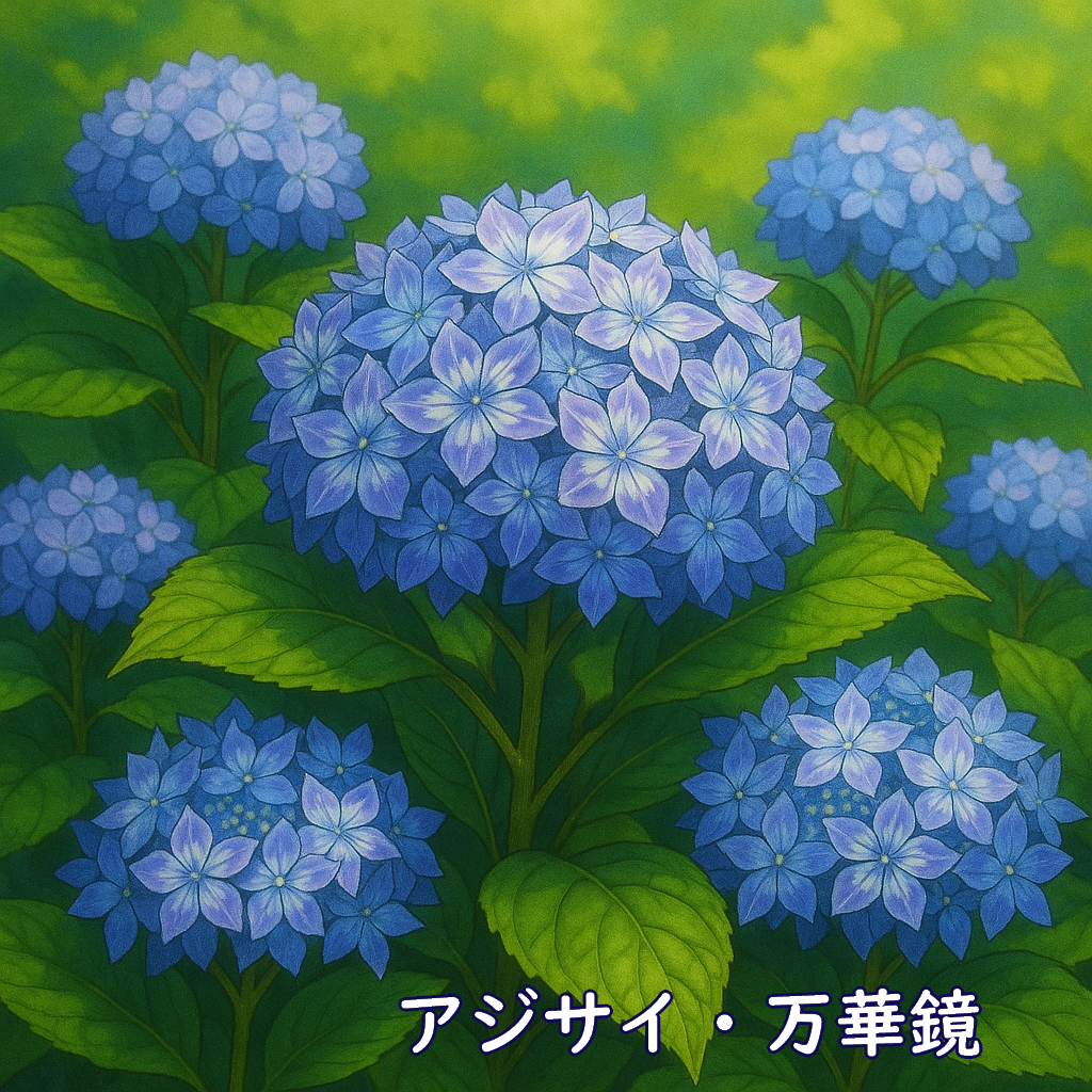 - アジサイ・万華鏡(ホンアジサイ系・額咲き/八重装飾花) – 星形の装飾花が重なり合う繊細な輪郭。土壌条件で青〜桃に発色し、雨に映える透明感が魅力。