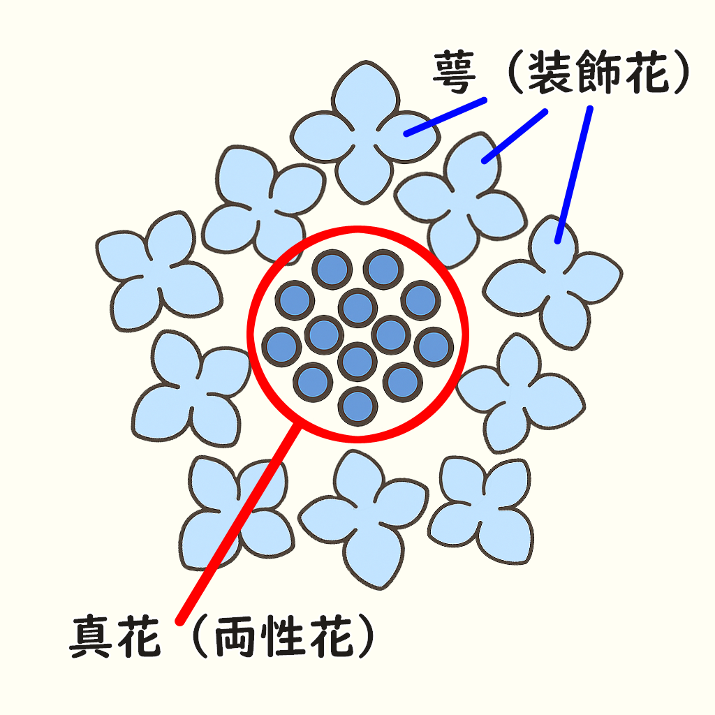 アジサイは、両性花(小花)の周りに、花弁状に見える萼片が発達した装飾花が縁取りをつくるのが特徴。