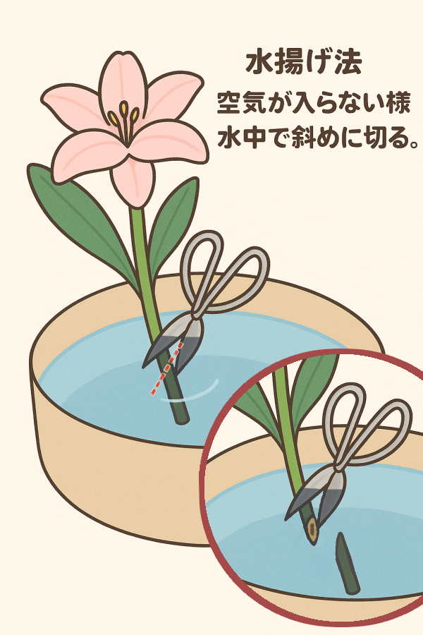 ・空気が入らないよう水中で茎を斜めに切る